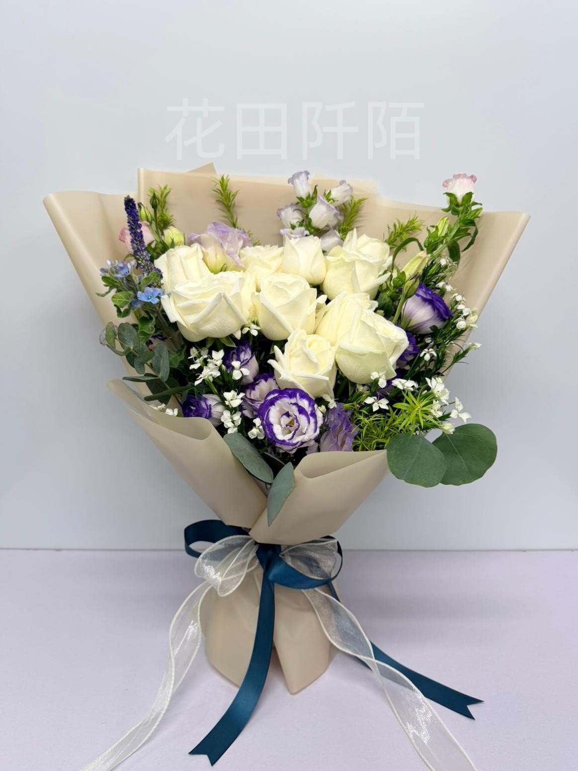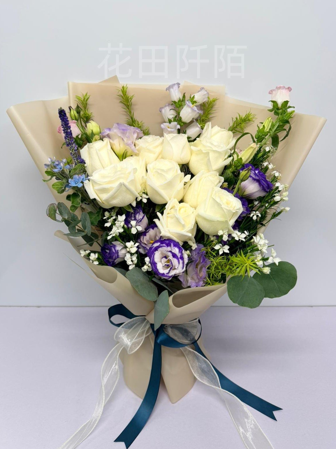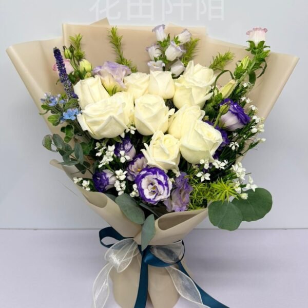 花材:12枝白玫瑰、風鈴花、洋桔梗