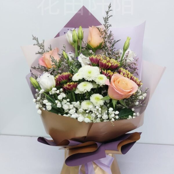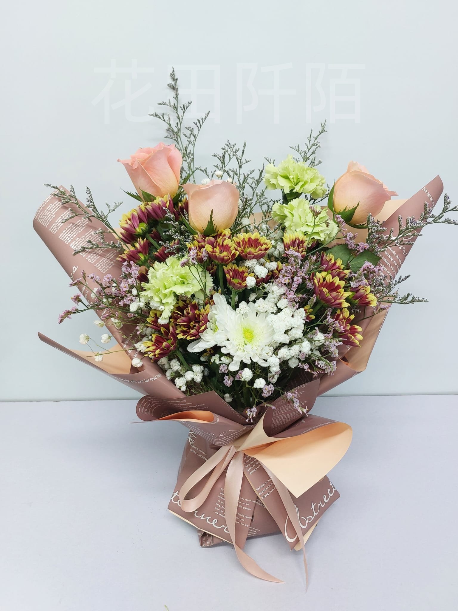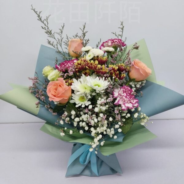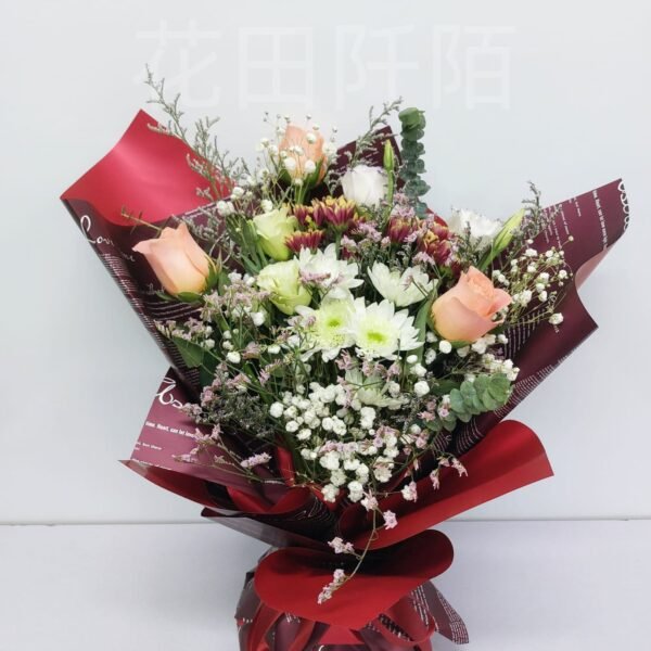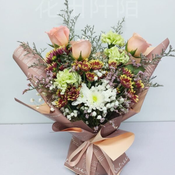 花材:3枝玫瑰,康乃馨,小菊