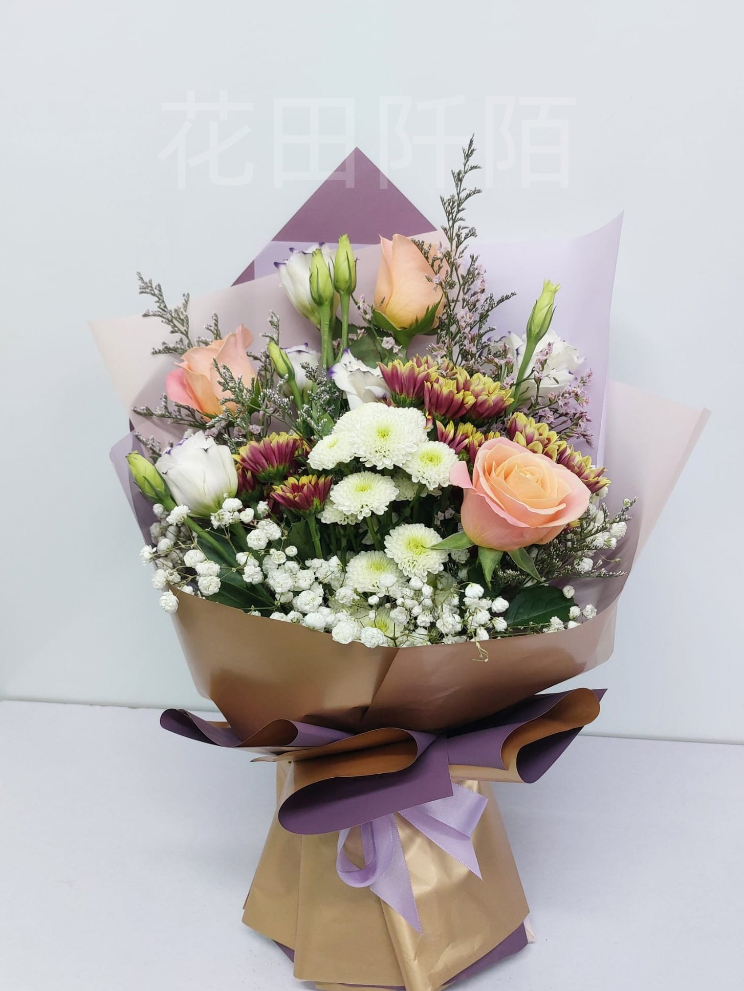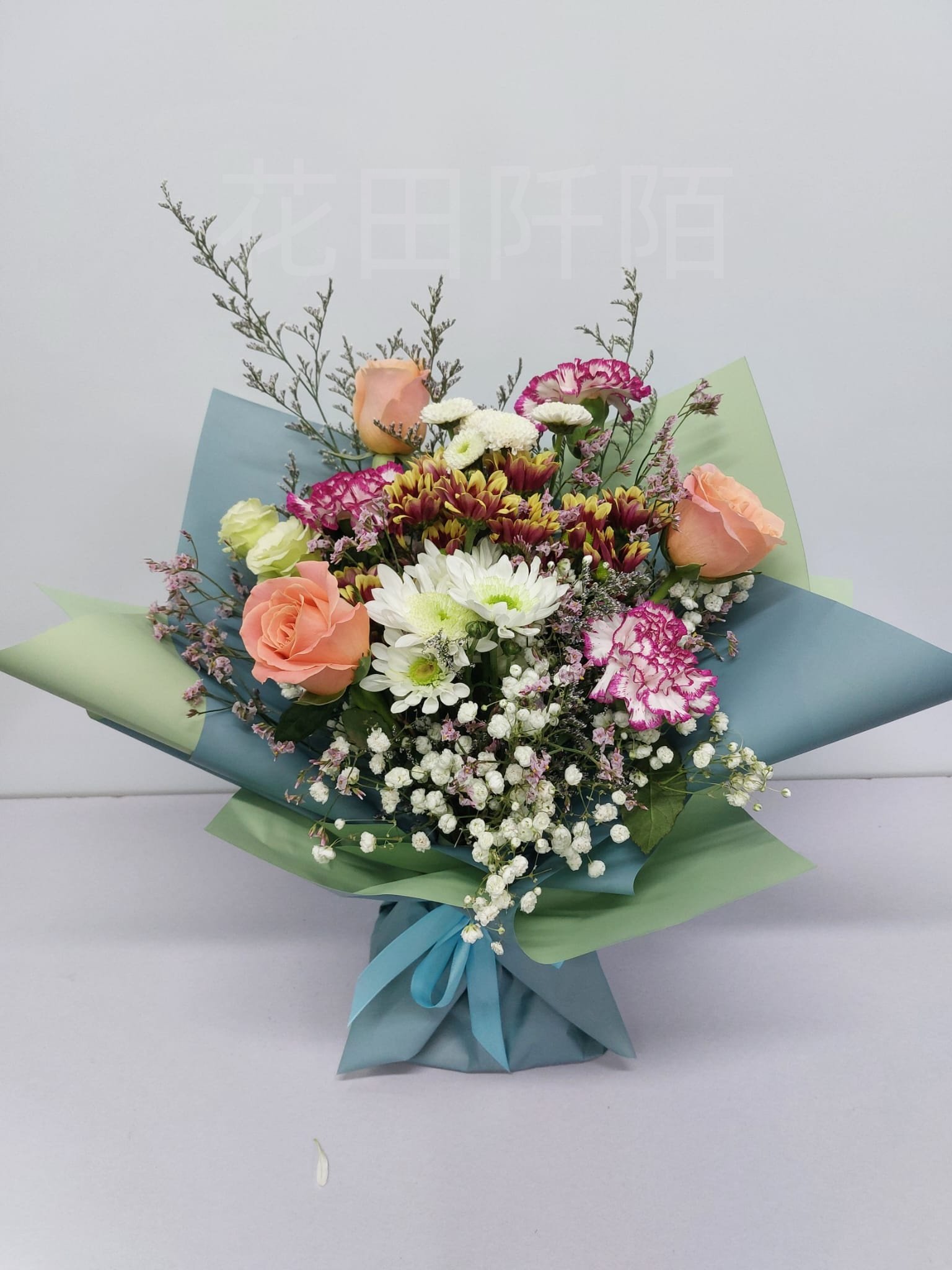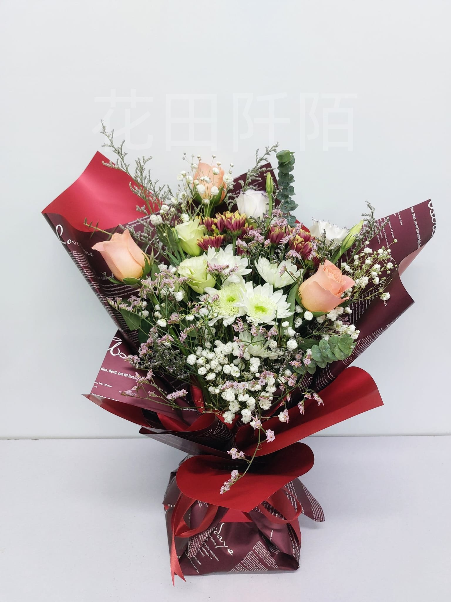 花材:3枝玫瑰,康乃馨,小菊