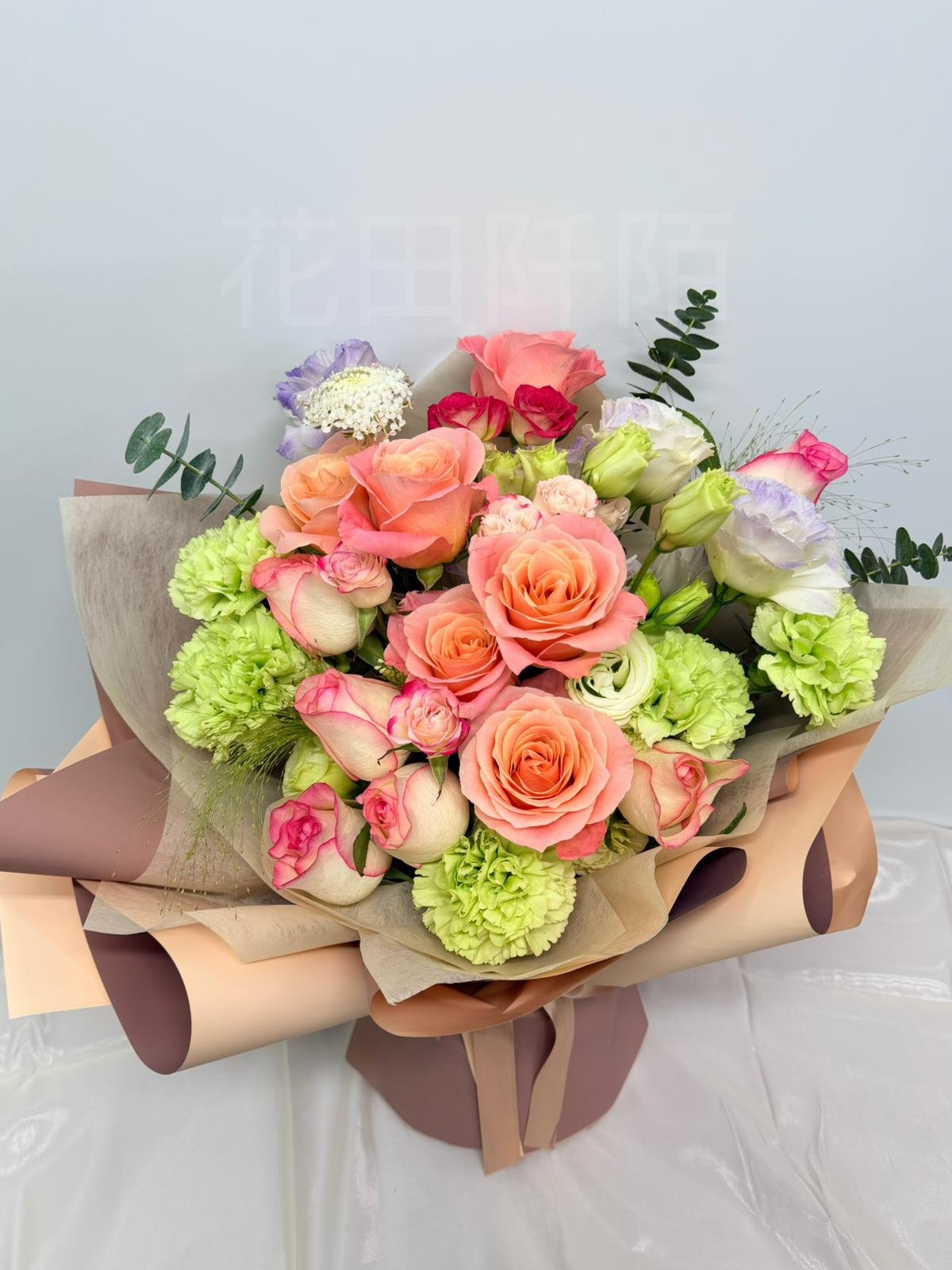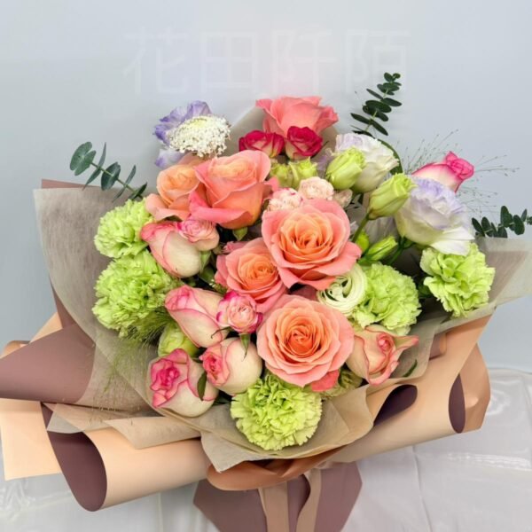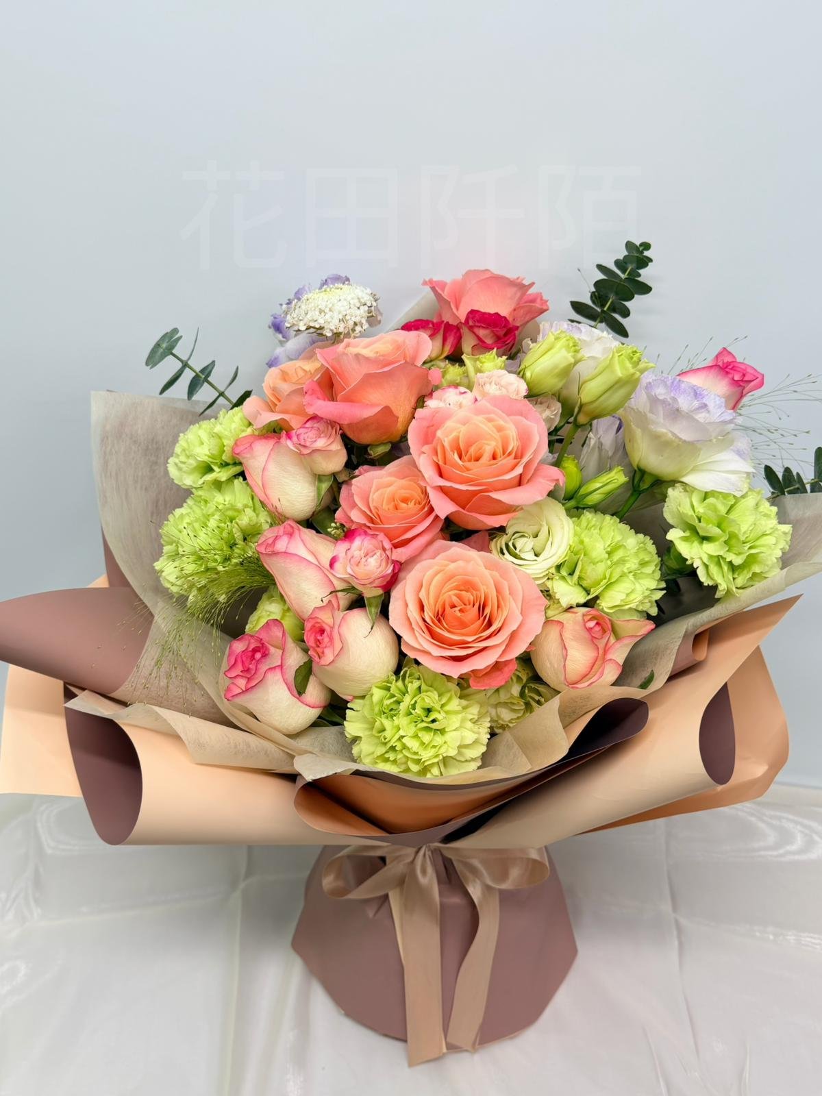 編號:FBRC99140 12枝玫瑰、折射小玫瑰、綠色康乃馨、洋桔梗、配花