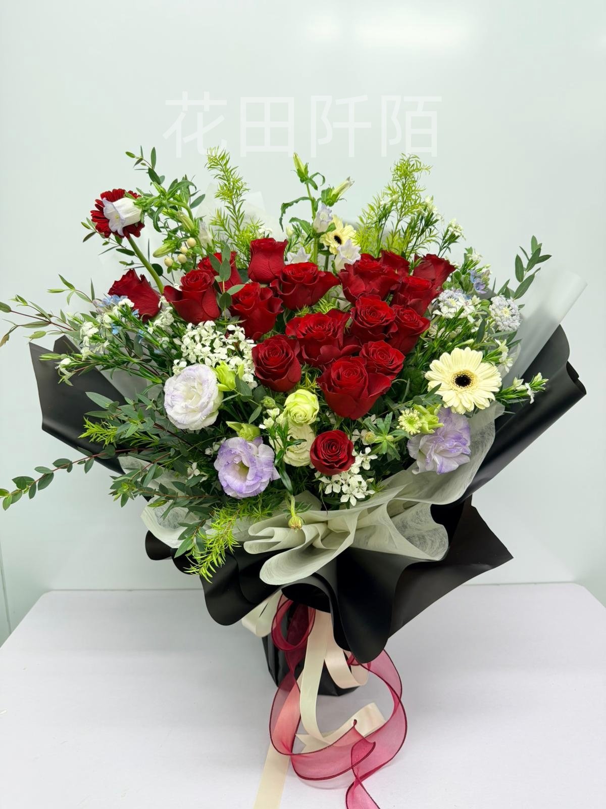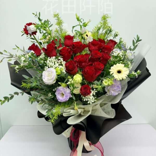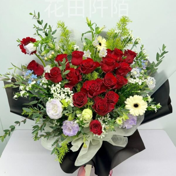 花材:18枝玫瑰,洋桔梗,非洲菊,風鈴花