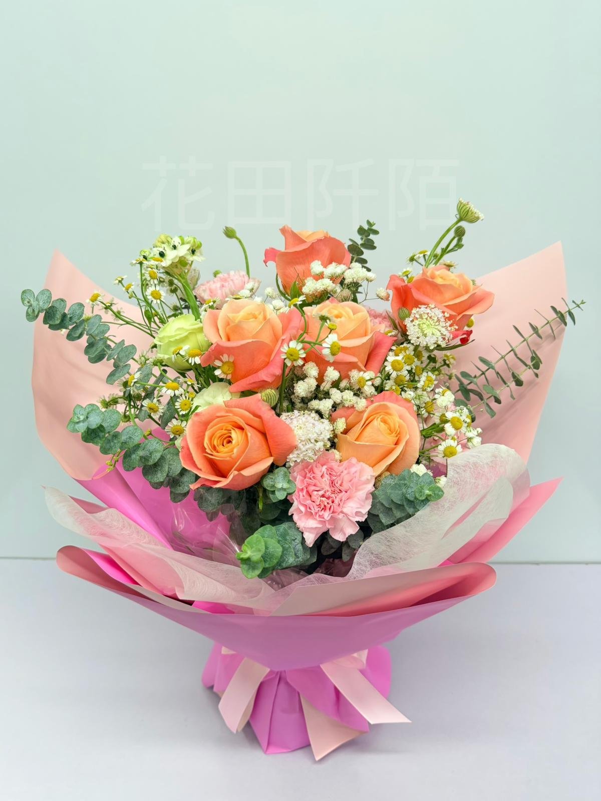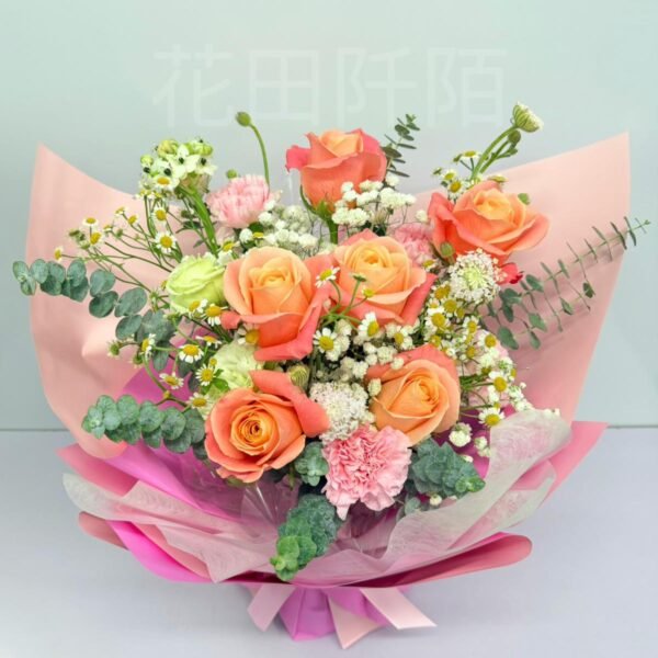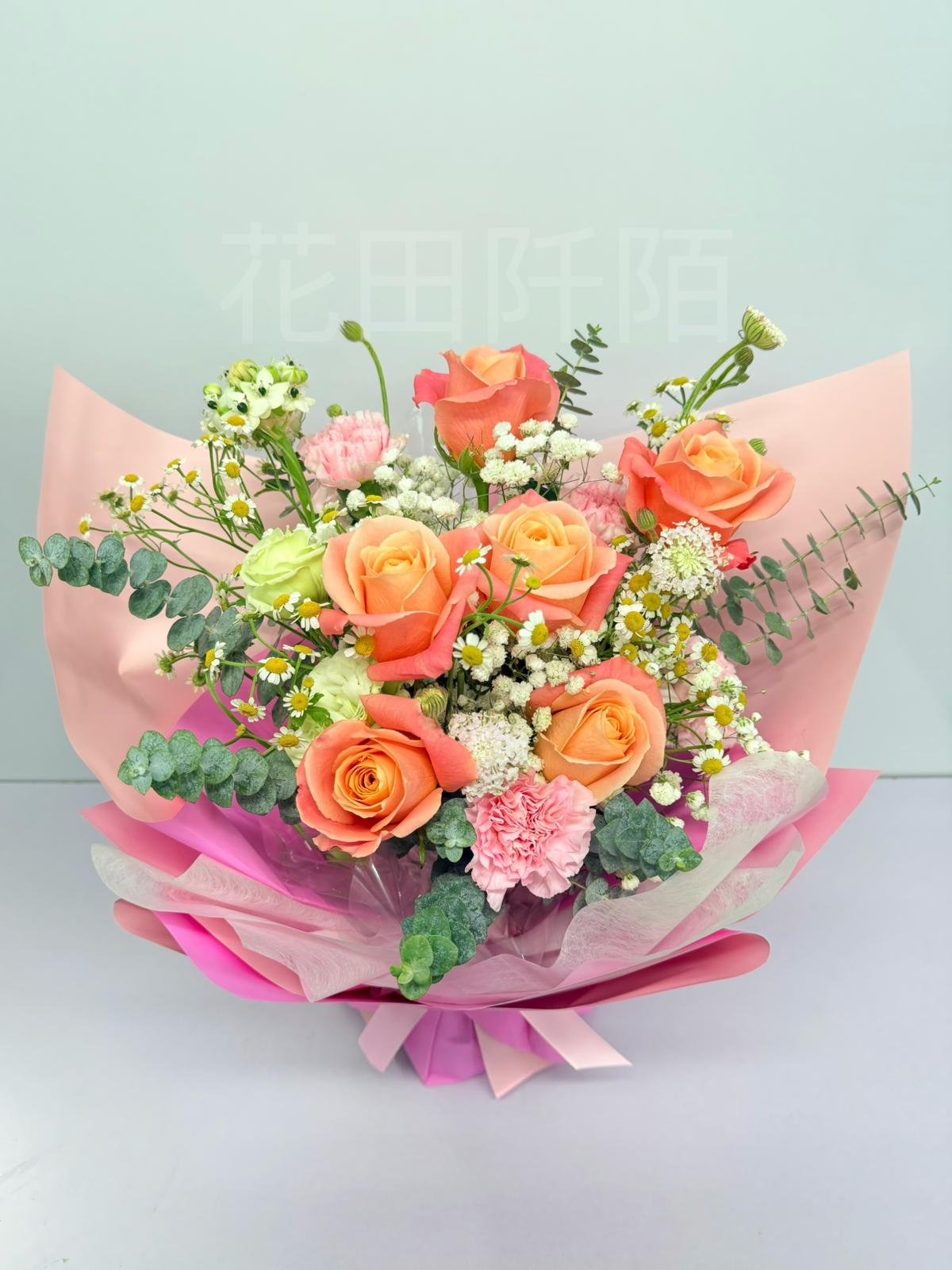 編號:FBR99123 橙粉色玫瑰、粉紅康乃馨、洋桔梗、特色配花
