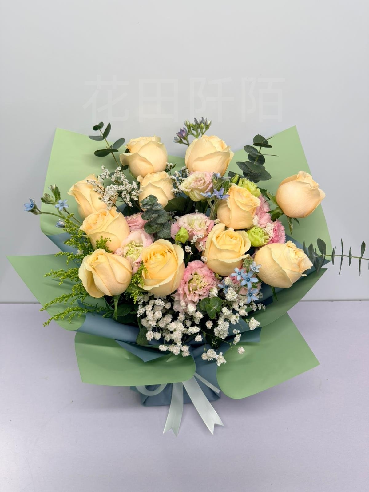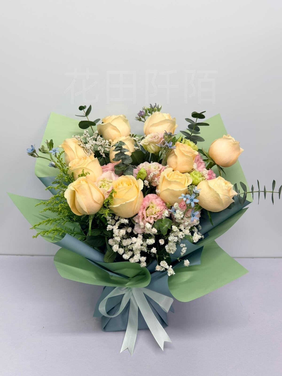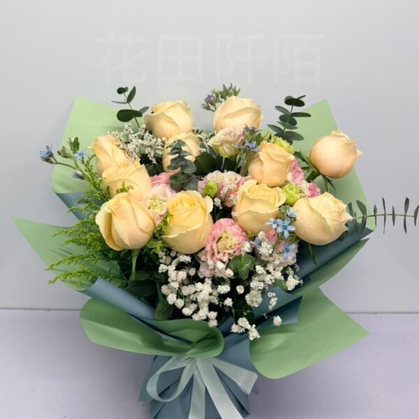 編號:FBR99010 11枝香檳色玫瑰、粉色洋桔梗、滿天星