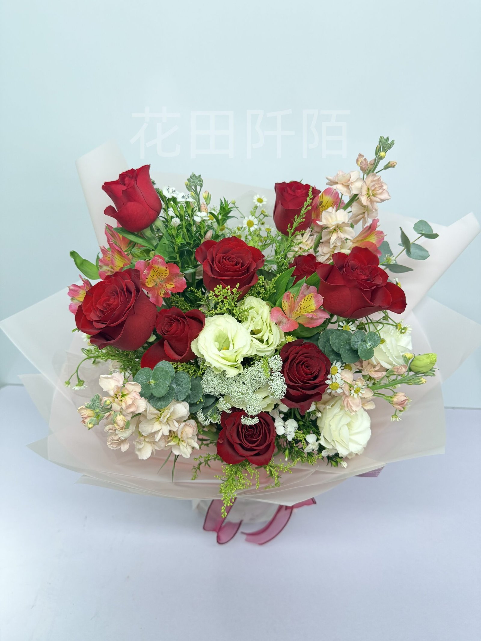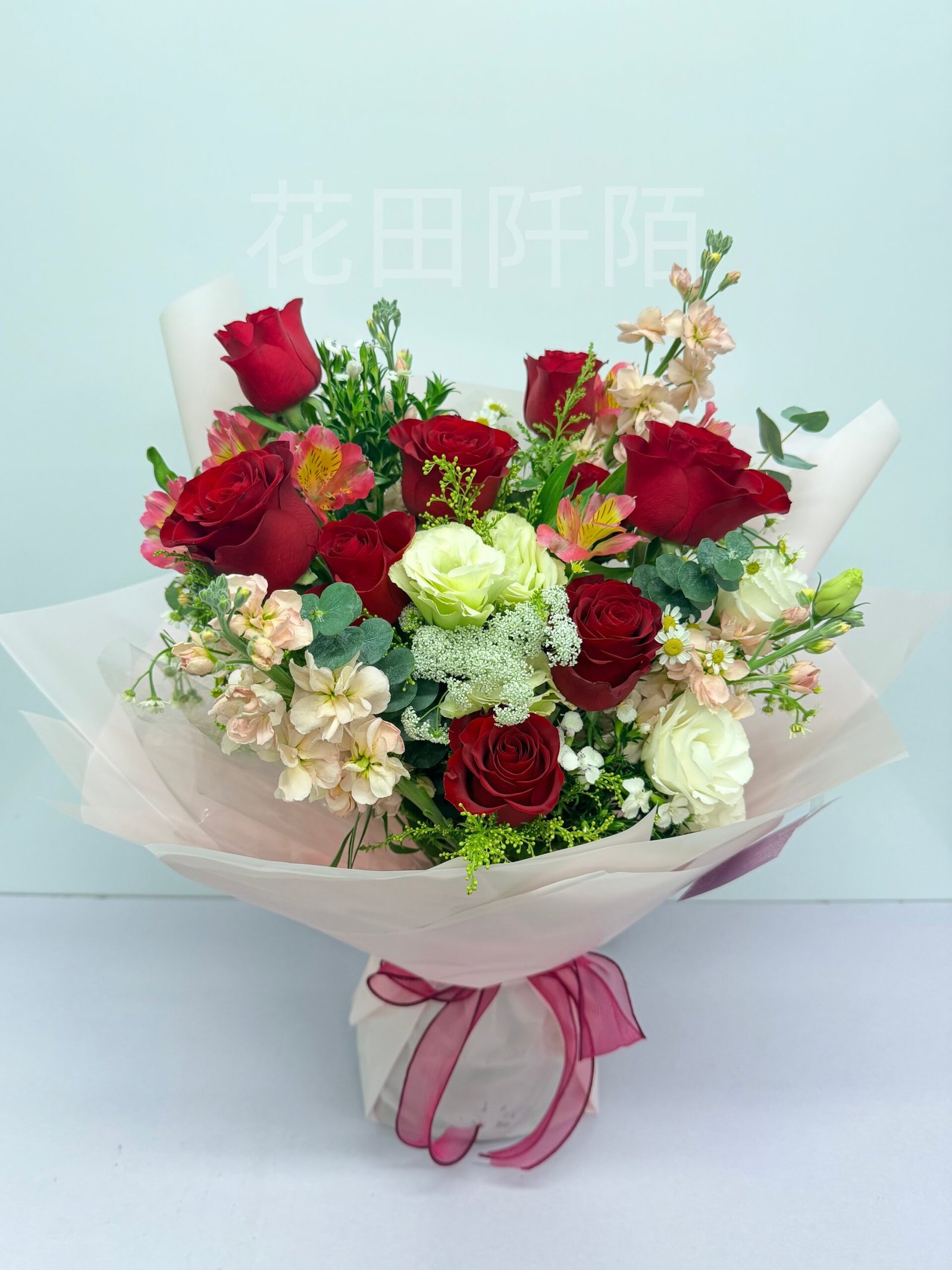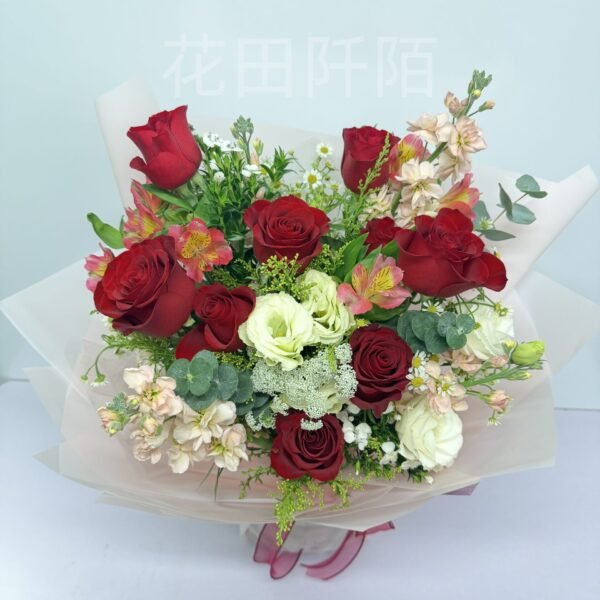 花材:9枝紅玫瑰、白色洋桔梗、水仙百合、香檳紫羅蘭、特別配花 主以紅玫瑰帶出全個花束﹗配花予以隆重感!