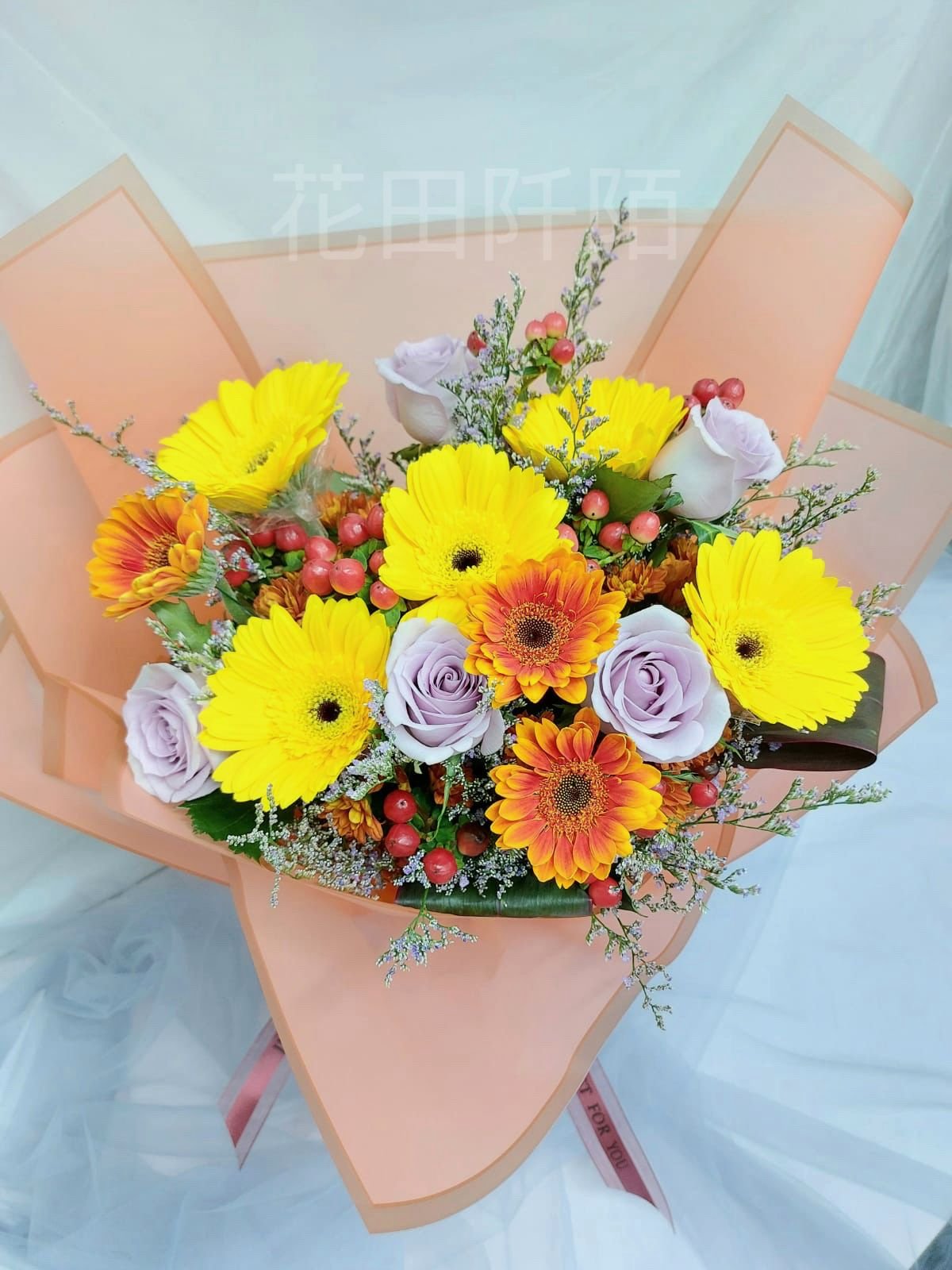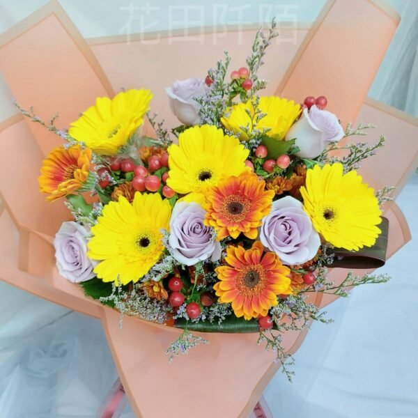 花材:5枝玫瑰,非洲菊,紅豆