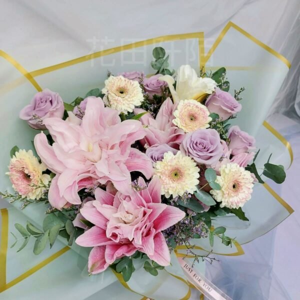 花材:重瓣百合,玫瑰,非洲菊