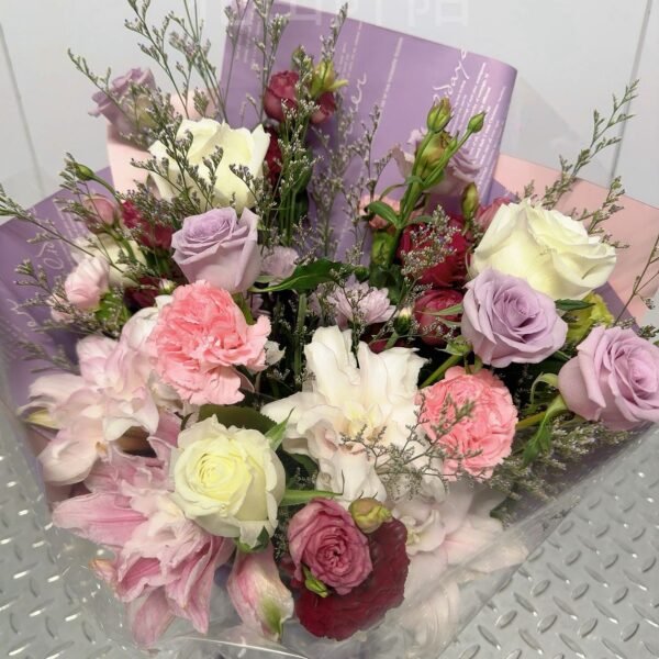 花材:7枝玫瑰,重瓣百合,康乃馨
