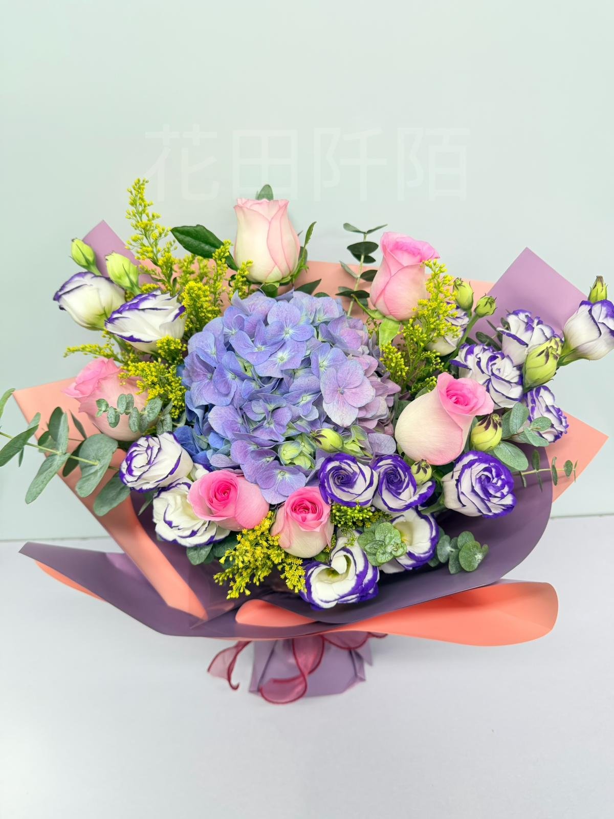 編號:FBHR99126 粉色玫瑰、粉紫雙色繡球、紫邊洋桔梗、配花