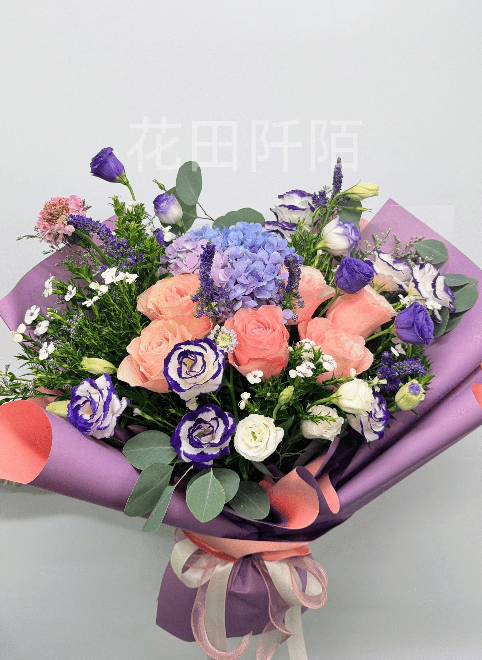 編號:FBHR99103 節日色彩賓紛系列花束:自取九折優惠~ 6枝粉色系玫瑰、粉藍紅雙色繡球、洋桔梗、配花 全紫、紫邊洋桔梗