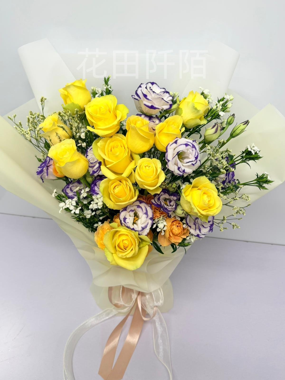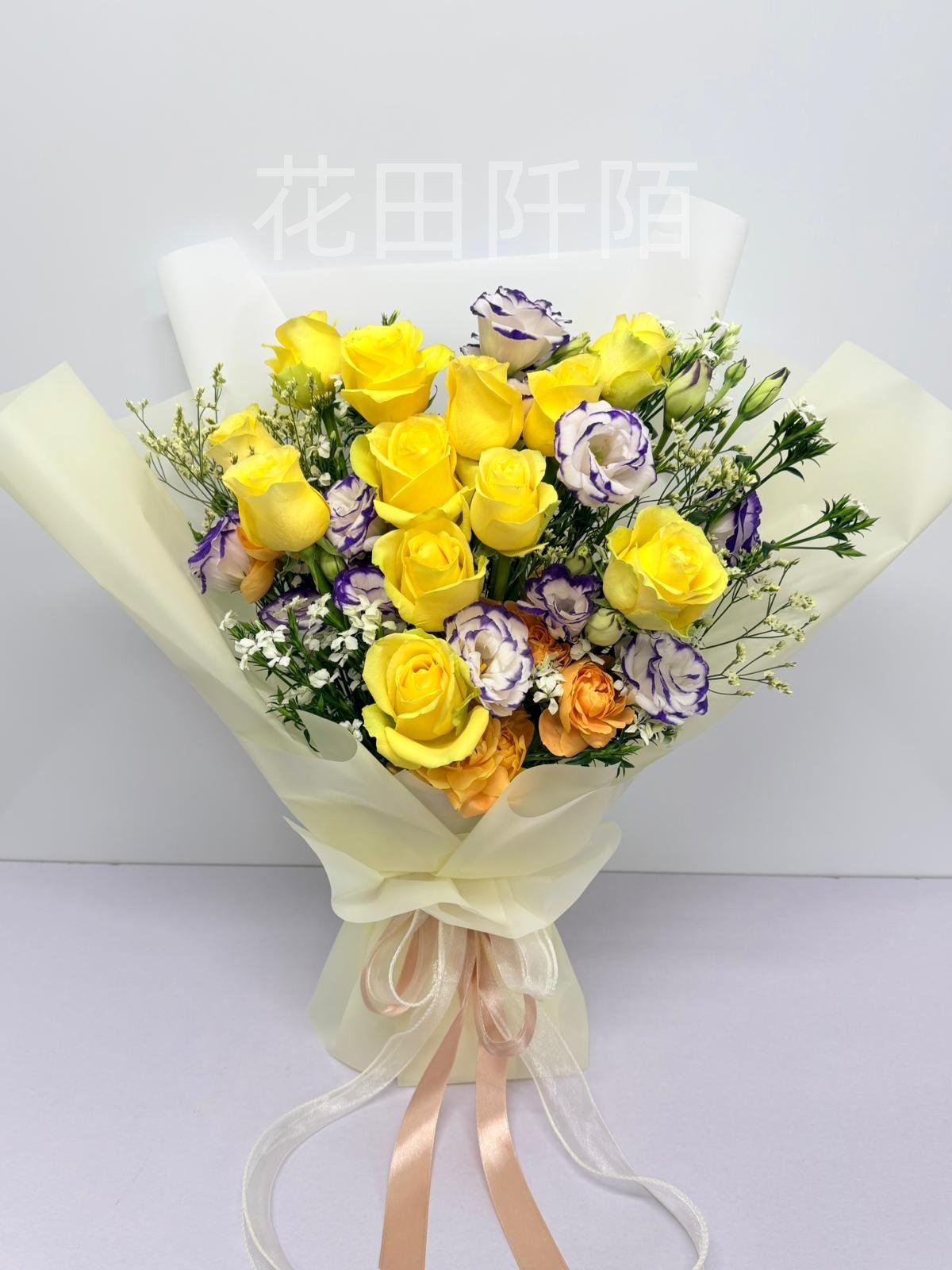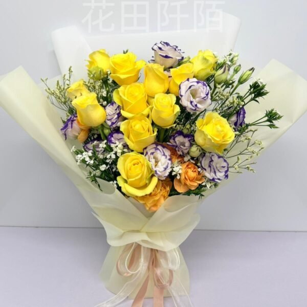 編號:FBR99115 黃玫瑰、紫邊洋桔梗、果汁陽台小玫瑰、配花
